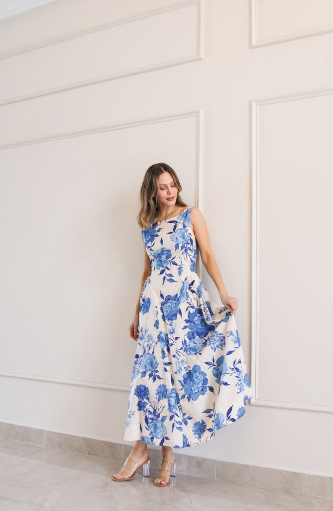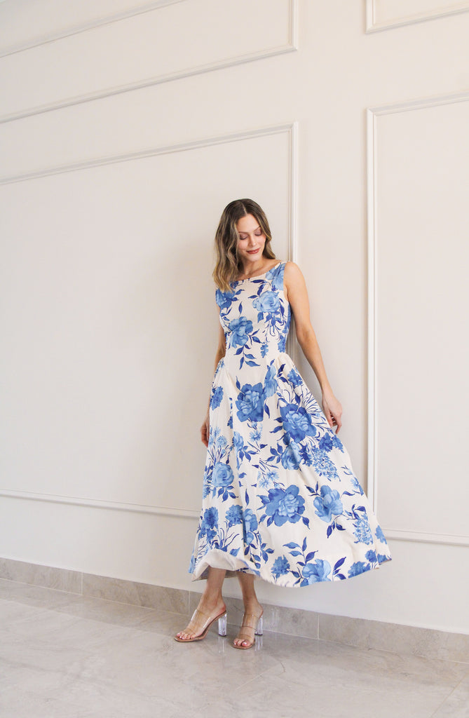 Vestido midi azul estampado de flores con detalles en cintura