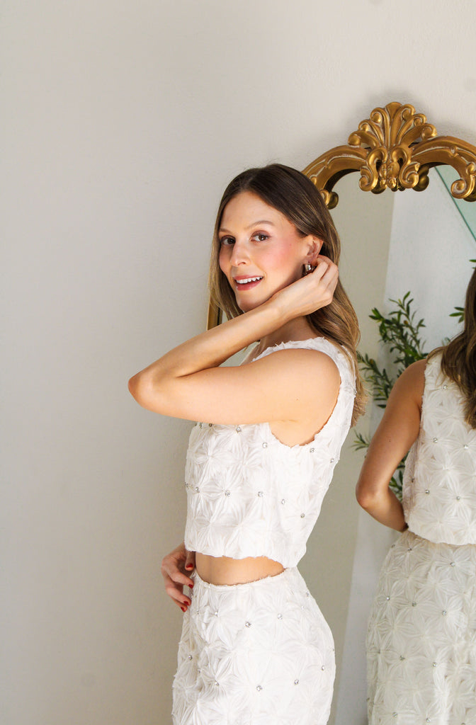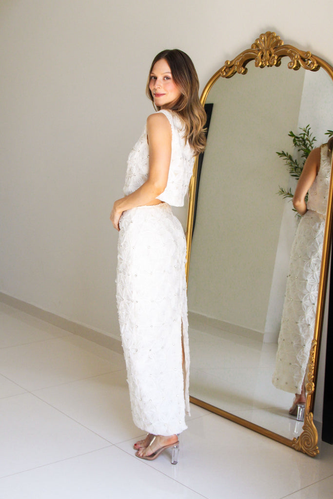 Set top y falda midi con flores en 3D y detalles en pedrería dándole un toque muy elegante y exclusivo