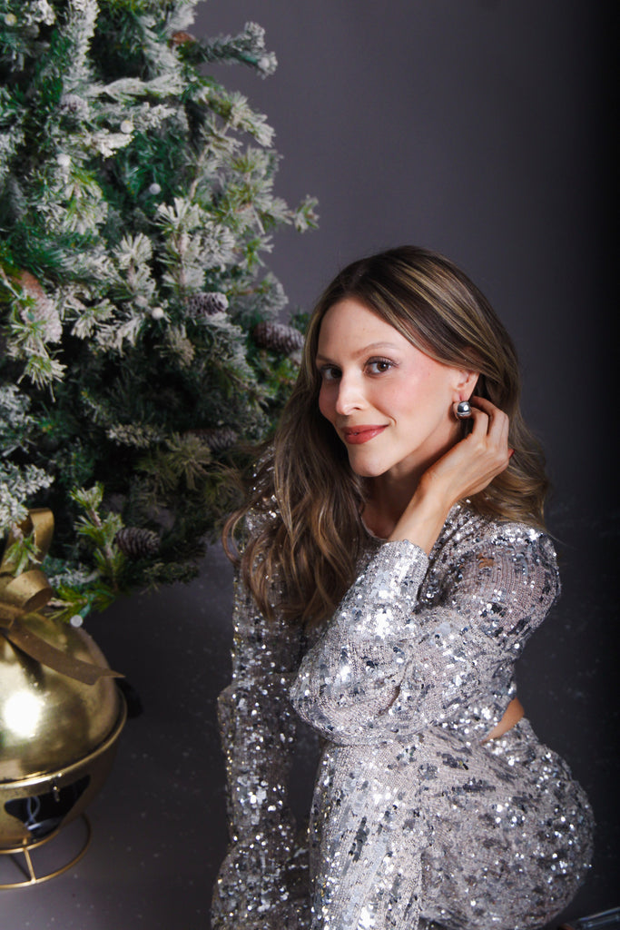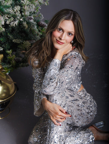 Set de lentejuela top con escote en espalda y pantalón con cierre oculto, ideal para esta temporada