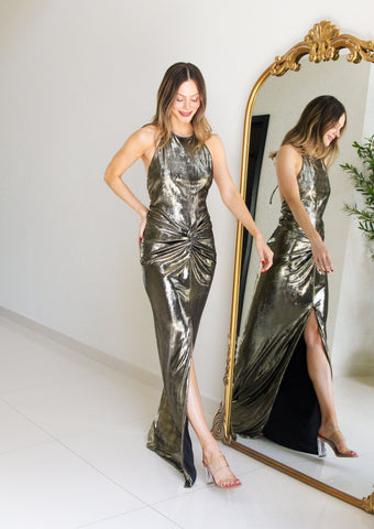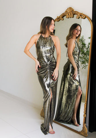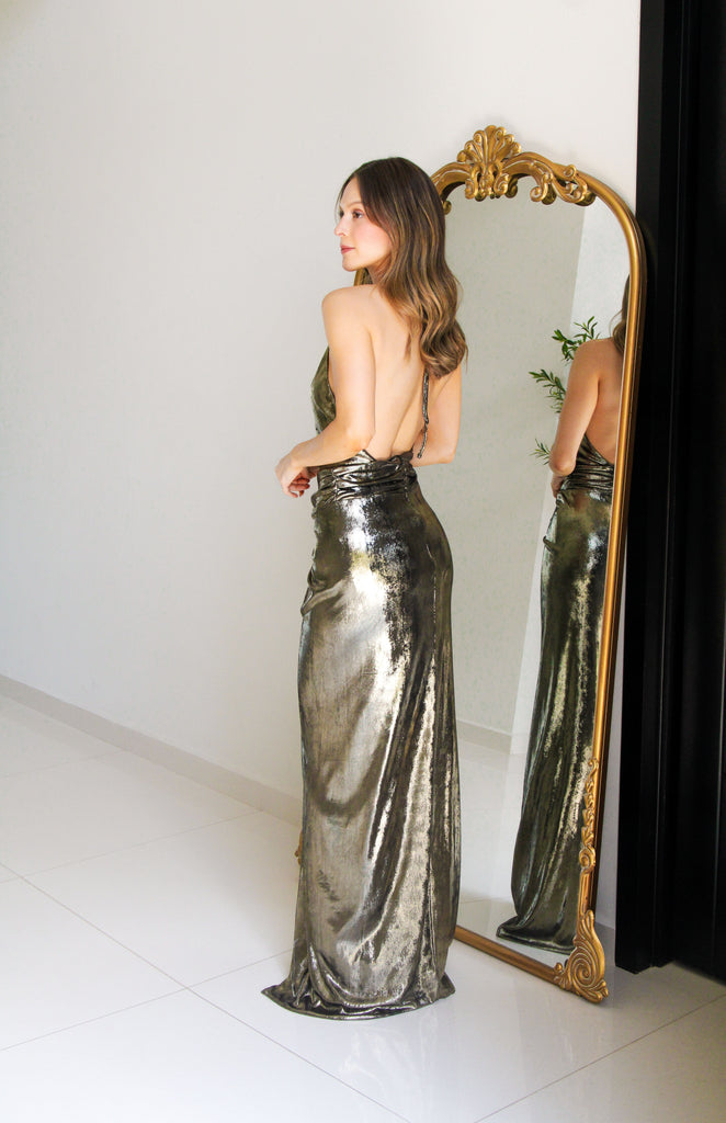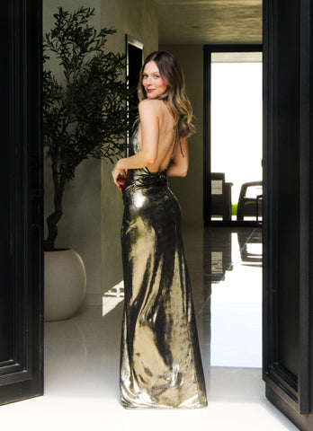 Vestido largo dorado con escote en espalda