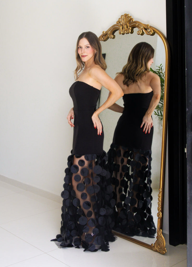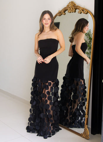 Vestido largo en color negro con falda en aplicaciónes con 3D
