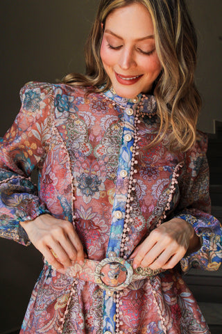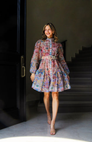 Vestido corto estampado divino, detalles de encaje con botones y cinto