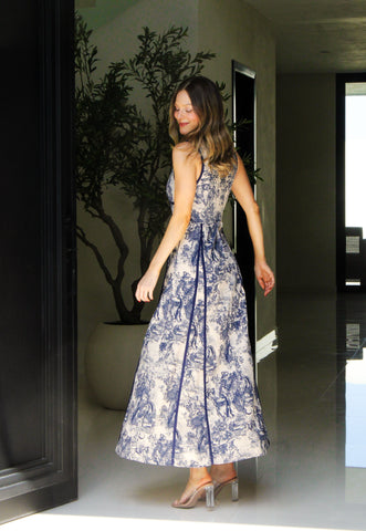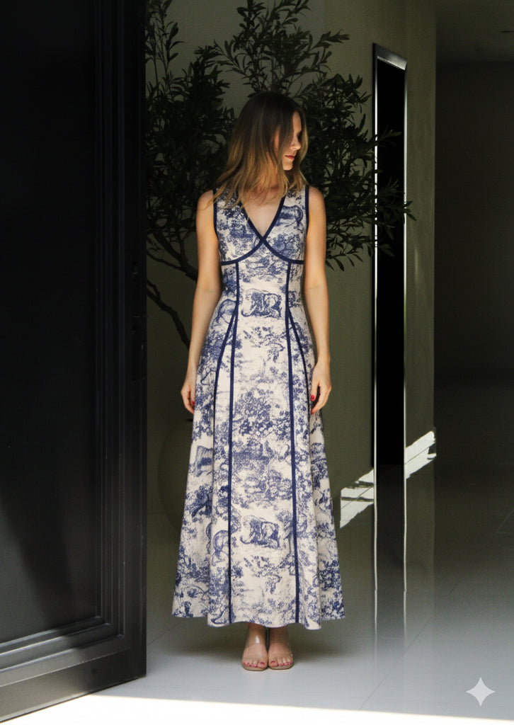 Vestido midi estampado en un tono azul divino con detalles de líneas que crean un fit perfecto, elástico en espalda para hacerlo más cómodo y un ligero escote.